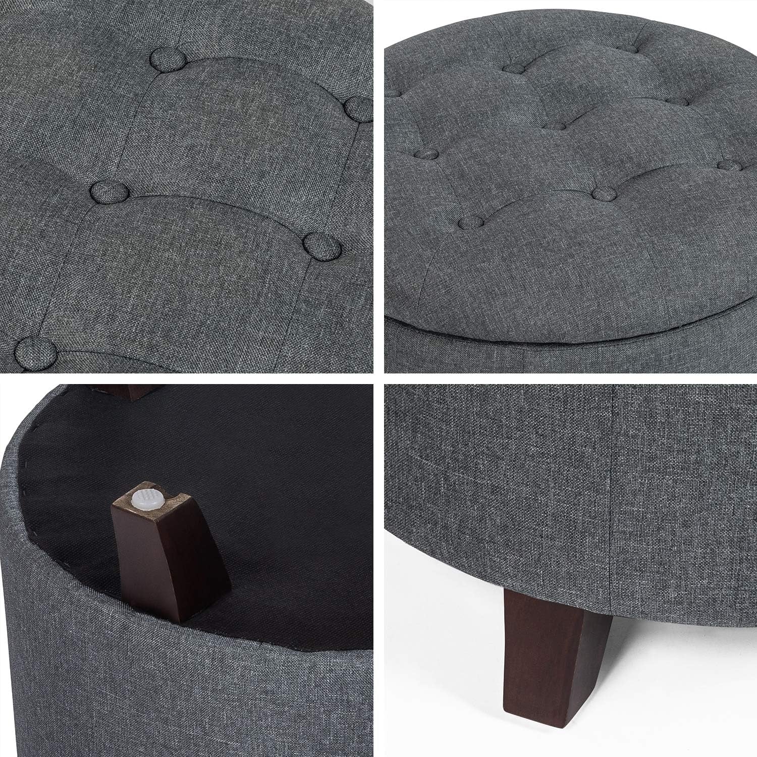 Elevate your living space with our versatile Round Gray Ottoman. Upholstered in premium fabric with exquisite button-tufting and fine stitching, this 19.75" × 17" piece offers hidden storage beneath its removable, foam-cushioned lid.