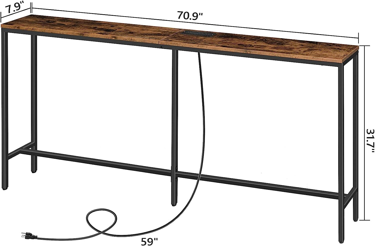 This industrial-style sofa table features a built-in power strip with 2 outlets, 2 USB ports, and a 59" cord, allowing you to conveniently charge multiple devices at once. Its versatile design works well as a console, entryway, or sofa table, fitting perfectly in tight spaces with its slim 70.9" length and 7.9" width.