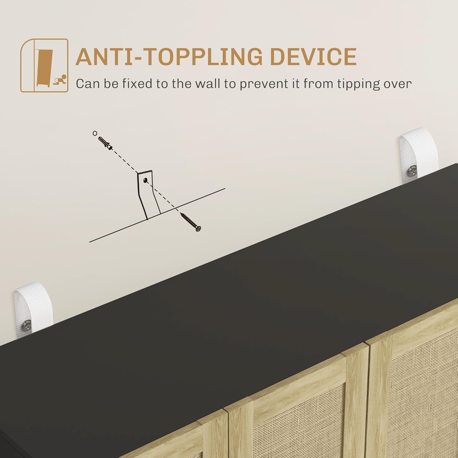 This meticulously designed 4 Door Rattan Wicker Buffet Cabinet merges sophisticated aesthetics with practical storage solutions. The signature woven rattan doors establish a distinctive Boho presence while enhancing various décor styles. Its adaptable 2-tier interior configuration provides customizable storage for diverse household items, from kitchenware to decorative pieces. Engineered from premium MDF with protective surface treatment, the 47.2" x 15.6" x 29.9" cabinet offers exceptional durability and simplified maintenance. Strategic elevated legs prevent moisture damage and simplify floor cleaning, complemented by an integrated anti-tipping mechanism for enhanced safety. With a weight capacity of 44 lbs overall and 11 lbs per shelf, this versatile piece transitions effortlessly between kitchen, dining, living, and office environments.
